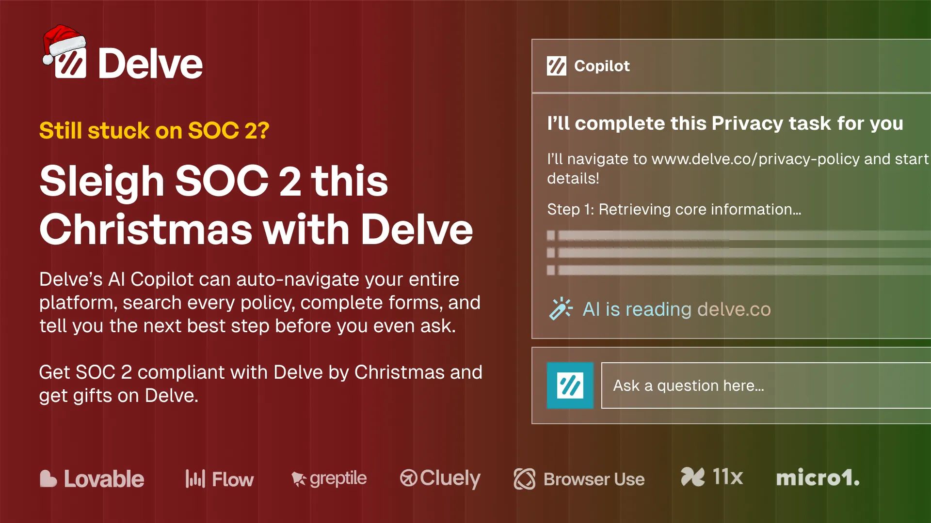 SOC 2 have you shivering? Sleigh it with Delve’s AI. Delve’s Copilot reads your policies, completes privacy tasks, fills SOC 2 evidence, and navigates your workflow from start to finish.Everything gets done for you automatically, without the manual grind that usually slows teams down. It extracts the right information, completes the forms you would normally struggle through, and moves each task forward without you lifting a finger. The result is a smoother, faster, and more reliable compliance process that stays on track even during your busiest season.Teams using Delve are seeing real outcomes.