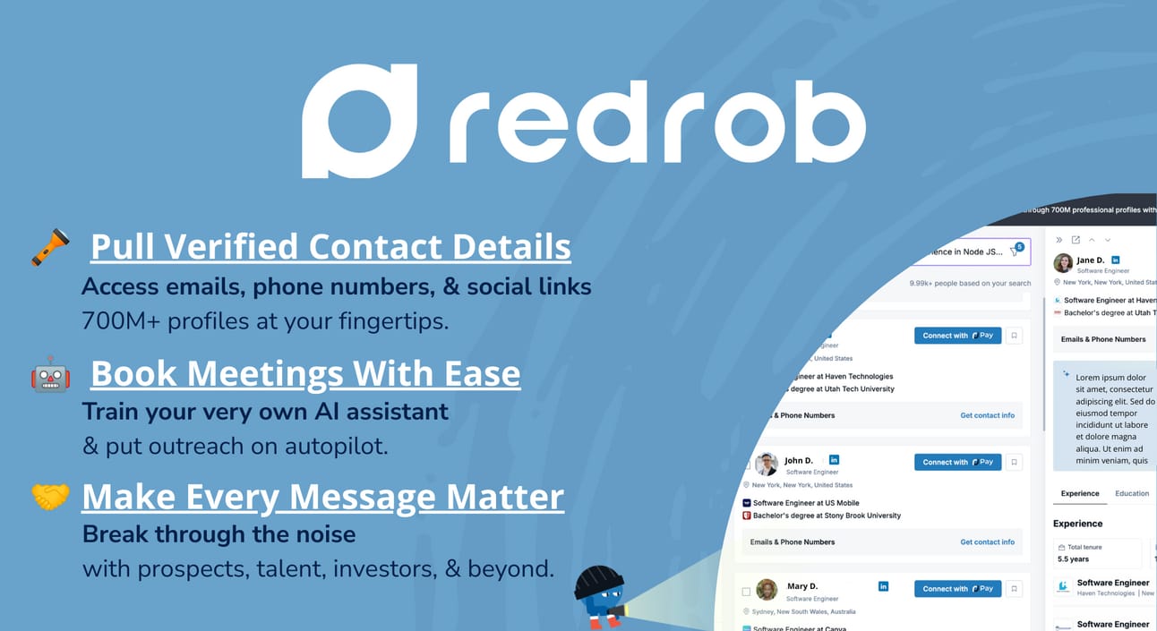 Tired of chasing cold leads? Redrob helps you reach top clients, investors, and talent from a database of 700M+ verified profiles. Use natural language search to find the right people and put outreach on autopilot to book high-value meetings—fast. More conversations, less legwork. Try it free for up to 6 months!
